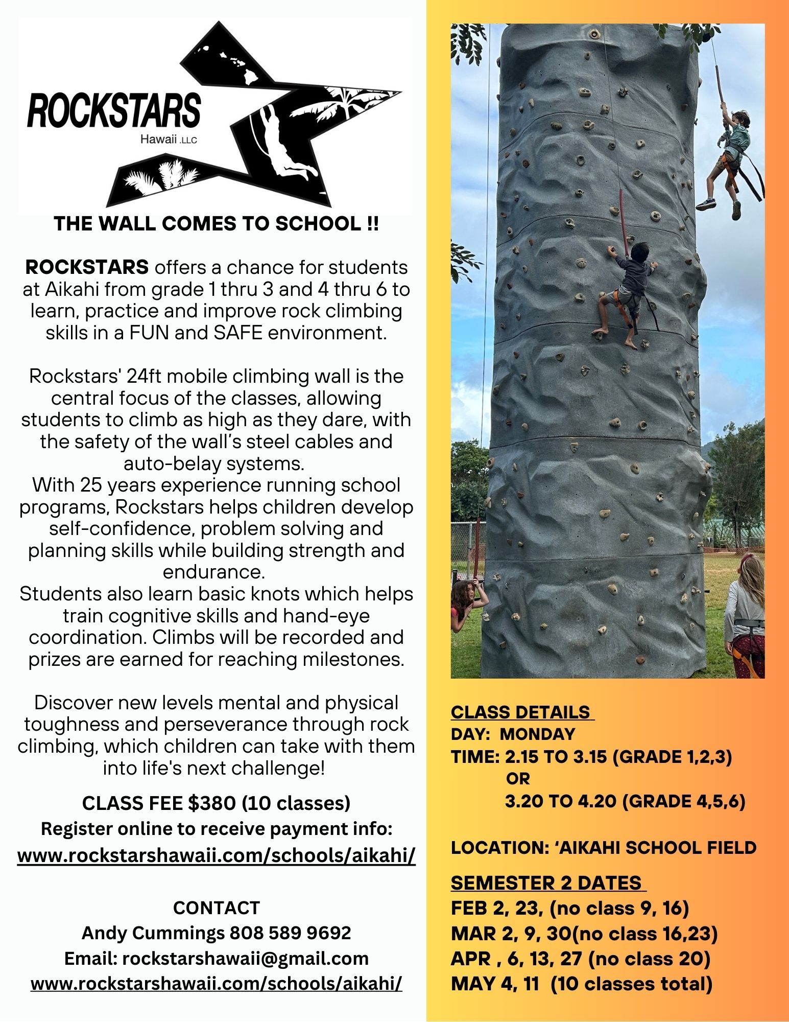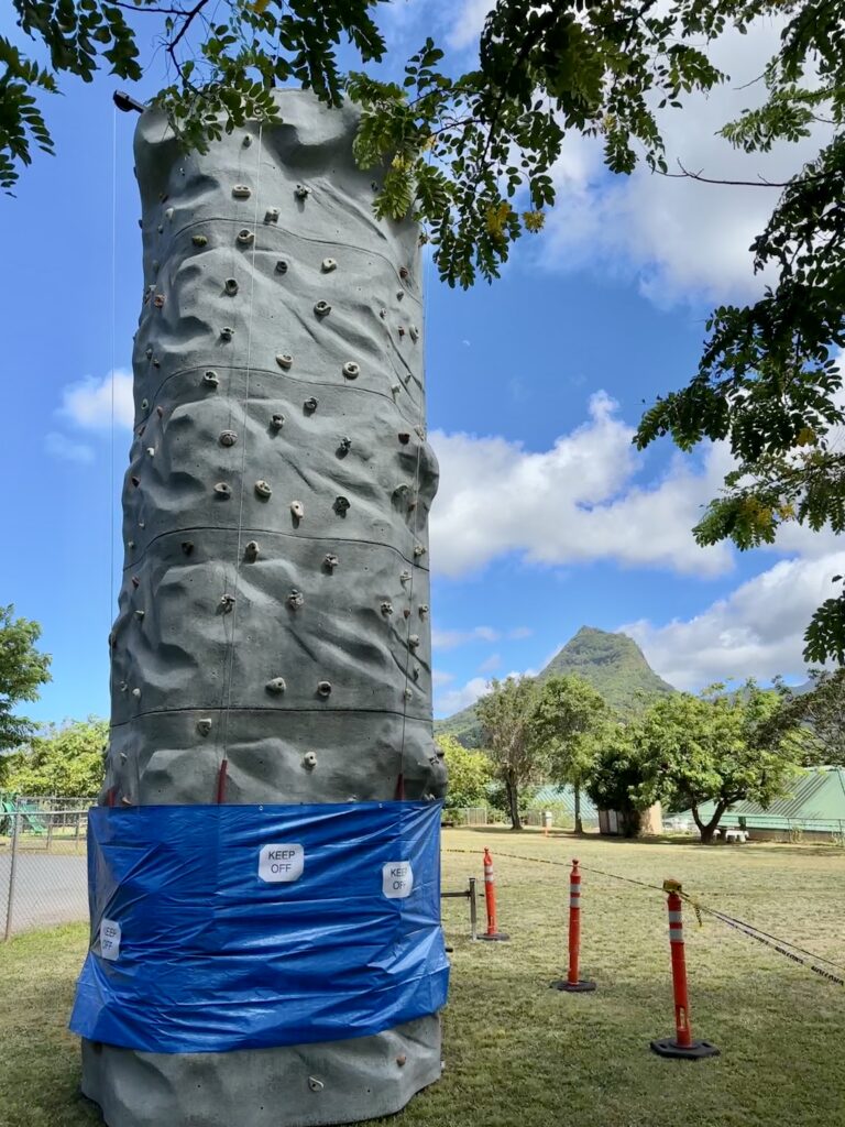 Rockstars operates on a mobile rock climbing wall. For rock climbing classes at Aikahi park, the wall will be set up on the field.