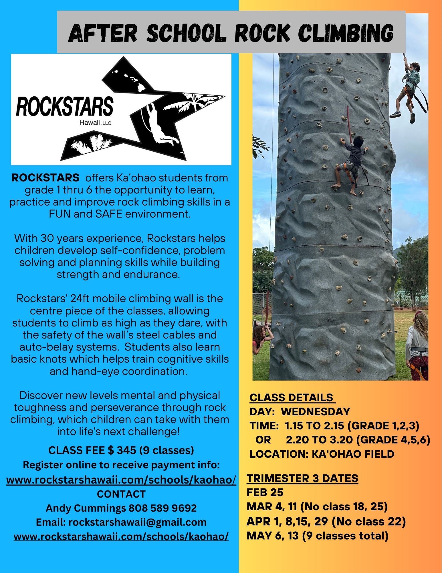 ROCKSTARS offers Ka’ohao students in grades 1-3 and 4-6 to learn, practice and improve rock climbing skills together in a FUN and SAFE environment!